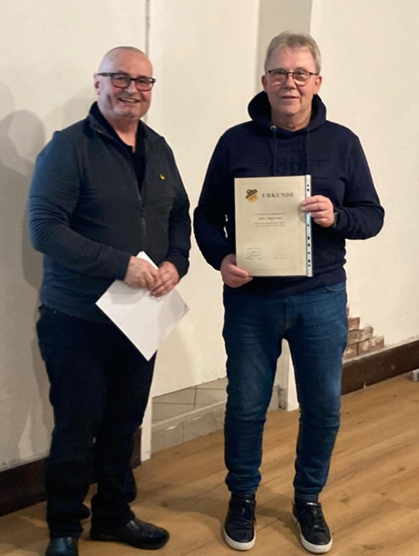 Der neue 1. Vorsitzende Mathias Porde überreichte Nadel und Urkunde.